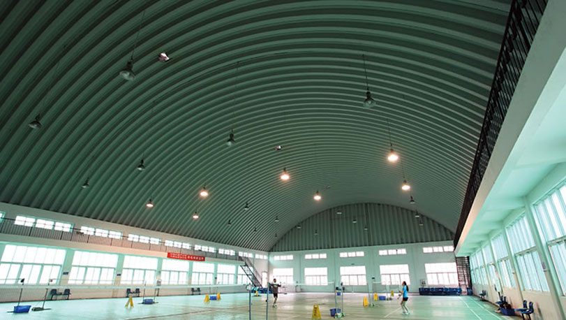 2003年建設(shè),拱型建筑。采用熱鍍鋅PE聚酯彩涂鋼板,顏色為海藍(lán)色,牌號為TS280GD,鍍鋅量180克/平方米。