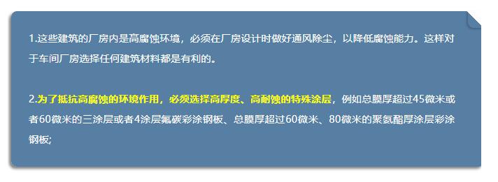 行業(yè)特點:有色金屬冶煉廠(銅、鋅、鋁、鉛等)是最挑戰(zhàn)彩板使用年限的,鋼廠、電廠等也會產(chǎn)生腐蝕性的介質(zhì),對彩涂板的抗腐蝕要求較高。