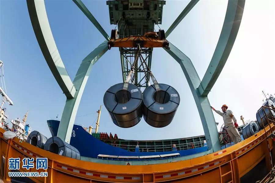 這是成品鋼材在寶鋼股份碼頭吊裝(資料照片)。新華社發(fā)(寶鋼股份供圖)