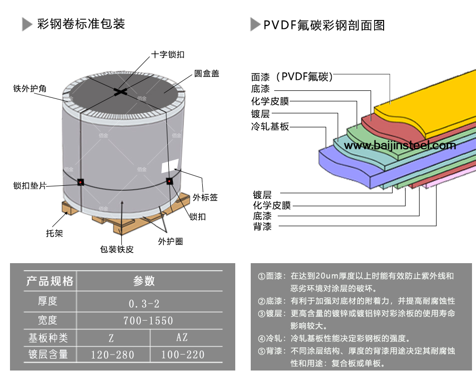 氟碳彩鋼板(PVDF)彩涂板中文學名聚偏氟乙烯彩涂板,是采用高端的聚偏氟乙烯樹脂。由于PVDF的化學鍵與化學鍵之間,有很強的鍵能,因此涂料具有非常好的防蝕性和色澤保持性,在建筑工業(yè)用彩涂鋼板涂料中,屬于最高級產品,且分子量大又為直鍵型結構,因此除耐化學藥品性之外,機械性能,耐紫外線和耐熱性能也很特出。在一般環(huán)境下,基防蝕年限可達20-25年之久。